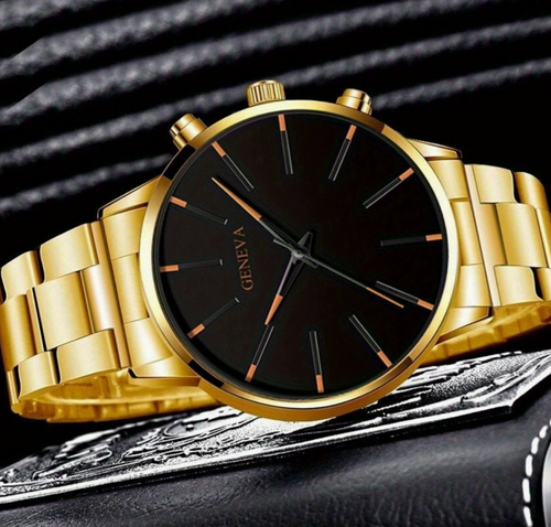 Luxury Gold Geneva Men Watch Set Classic Business Quartz Wristwatch Hip Hop Bracelet Necklace Ring 4Pcs Fashion Male Jewelry Gift Set
